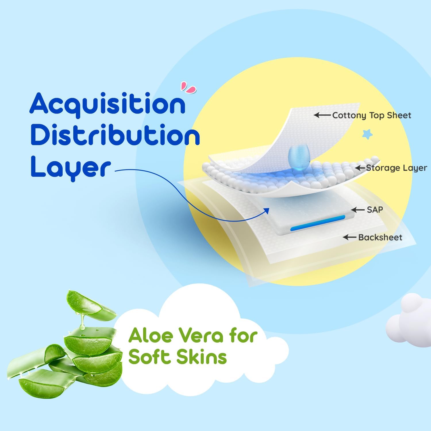 HIGH ABSORBENCY:- The large absorbing area of the pad ensures maximum dryness for the baby. It can hold up to 7 glasses of liquid where 1 glass is equal to 50 ml.