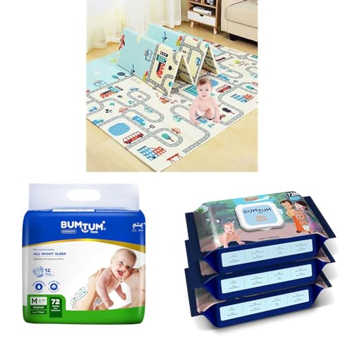 BUMTUM Waterproof Portable Foldable Foam Baby Play Mat & Bumtum Baby Diaper Pants, Medium Size, 72 Count (Pack of 1) & Baby Chota Bheem Gentle Soft Moisturizing Wet Wipes (Pack of 3, 72 Pcs. Per Pack)