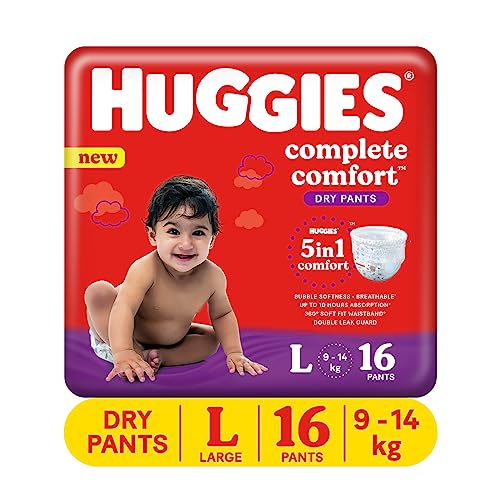 Huggies Complete Comfort Dry Pants Large (L) Size Baby Diaper Pants, 16 count, with 5 in 1 Comfort
