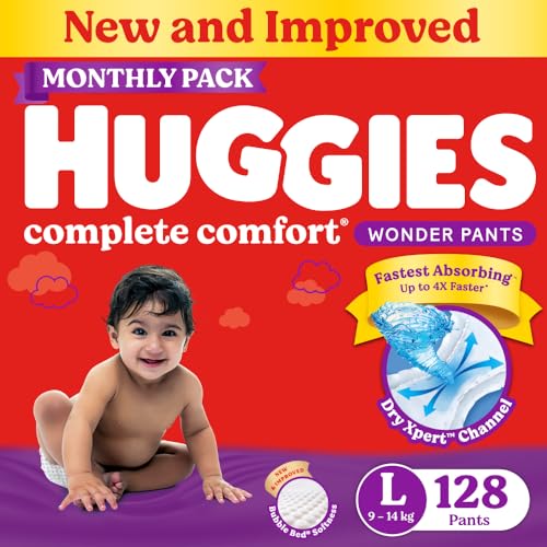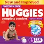 Huggies Complete Comfort Wonder Pants | Pant Style Baby Diapers L Size, 128 Count | India's Fastest Absorbing Diaper, Patented Dry Xpert Channel, Ideal for 9 to 14 Kgs