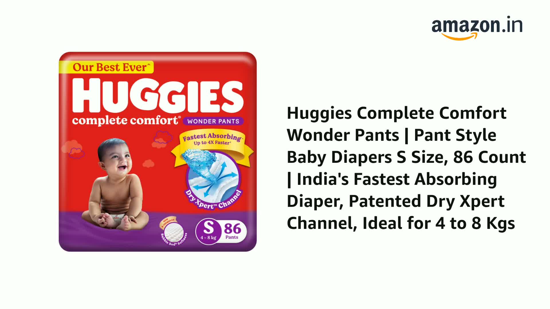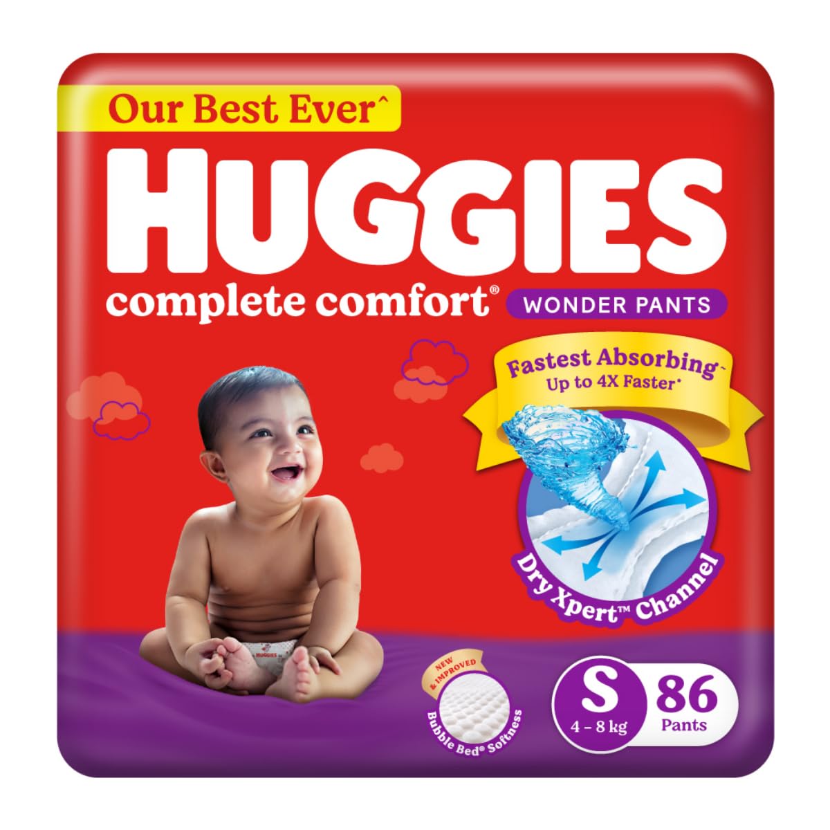 Huggies Complete Comfort Wonder Pants | Pant Style Baby Diapers S Size, 86 Count | India's Fastest Absorbing Diaper, Patented Dry Xpert Channel, Ideal for 4 to 8 Kgs