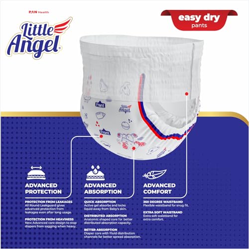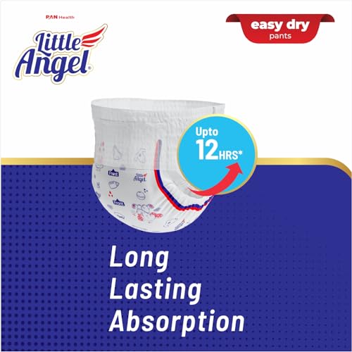 Little angel easy dry pants are made specially for the Indian baby. With first in category features like wetness indicator. Extra thin core designed to give superior absorbency and keep your little angel’s skin dry all day long. It is made with ultra-soft air fresh material and a 360degree soft elastic band to keep your little one’s delicate skin protected from diaper rashes.• ADVANCED PROTECTION – • ADVANCED ABSORPTION – Quick Absorption – • Better Absorption – • ADVACED COMFORT – 360degree Waistband.