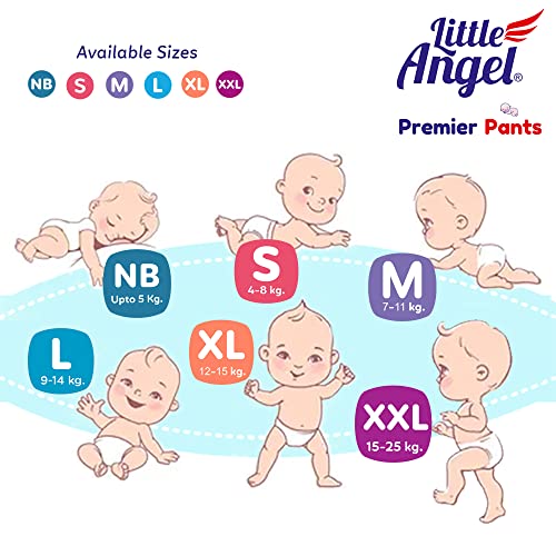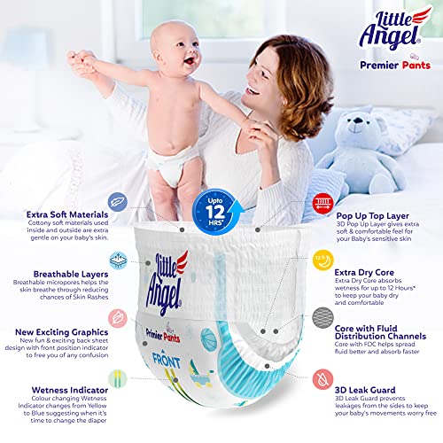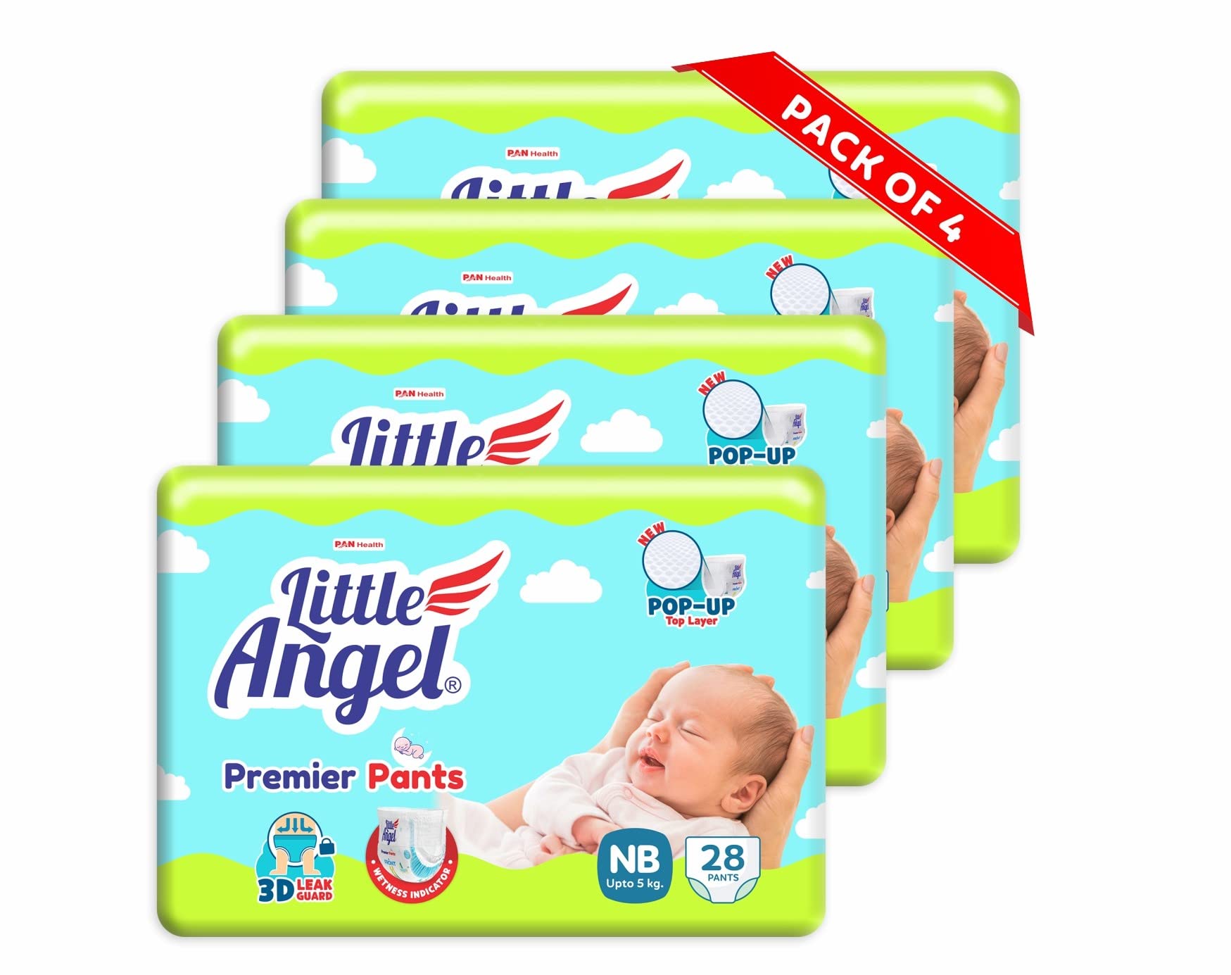 HomeBabyDiaperingBaby DiapersLittle Angel Premier Pants Baby Diapers, New Born (NB) Size, 112 Count, Combo Pack of 4, 28 Count/Pack with Wetness Indicator, up to 5 Kg