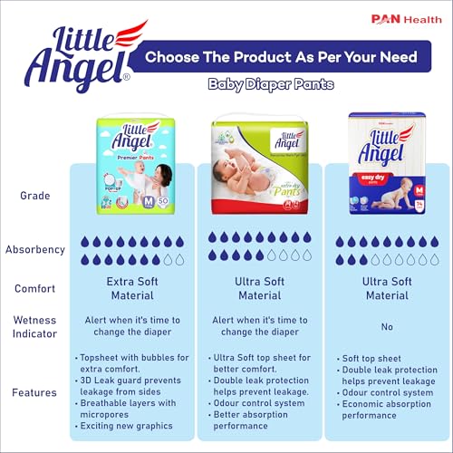 Little angel easy dry pants are made specially for the Indian baby. With first in category features like wetness indicator. Extra thin core designed to give superior absorbency and keep your little angel’s skin dry all day long. It is made with ultra-soft air fresh material and a 360degree soft elastic band to keep your little one’s delicate skin protected from diaper rashes.• ADVANCED PROTECTION – • ADVANCED ABSORPTION – Quick Absorption – • Better Absorption – • ADVACED COMFORT – 360degree Waistband.