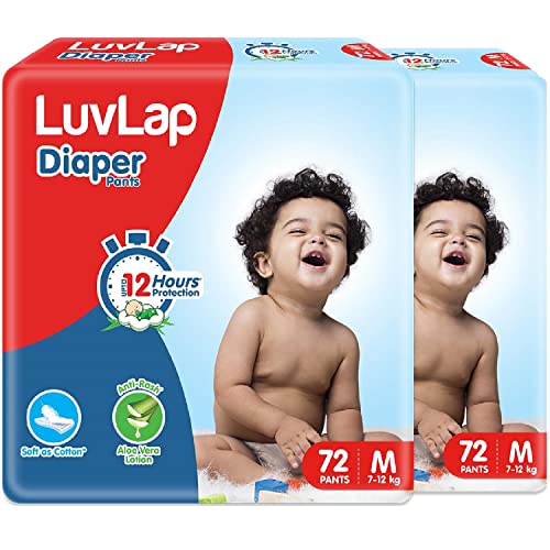 LuvLap Baby Diaper Pants M Size (Medium) with Aloe Vera Lotion for rash protection Pack of 144 Count (72x2) with upto 12Hr protection For babies of 7 to 12Kg Jumbo packAvailable sizes - Newborn (upto 5Kg) Small (4-8 Kg) Medium (7-12Kg) Large (9-14Kg) XL (12-17Kg)LuvLap Paraben Free wipes for baby skin with Aloe Vera Fragrance Free pH Balanced Dermatologically Safe Baby Wipes Rich in Vitamin E & chamomile extract 72 Wipes / Pack 6 PacksLuvLap moisturizing baby wipes with aloe vera are the perfect wipes for your baby's delicate skin. Enriched with the goodness of aloe vera and chamomile they are completely free of alcohol and harmful parabens. After all your baby's safety is our prime concern.