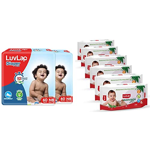 LuvLap Baby Diaper Pants Pack of 120 Count (60x3), Extra Small (XS), & LuvLap Paraben Free wipes for baby skin/Pack, 6 Packs