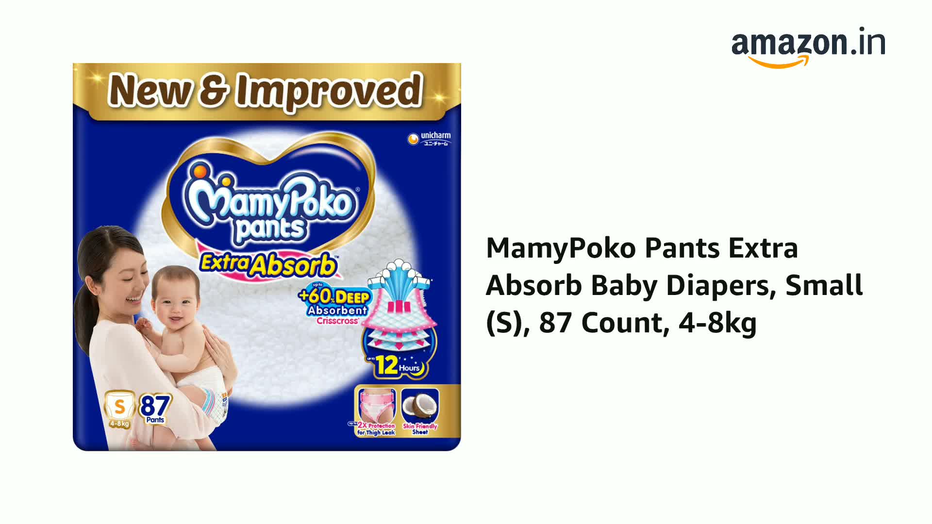 Best 12 hours absorbent pants ever in MamyPoko product history in India has +60% Deep Absorbent CrissCrosswith extra 3rd layer that absorbs urine deeply and provides 2x protection for thigh leakage without sogginess whole night so baby & mother can sleep deeply whole night".