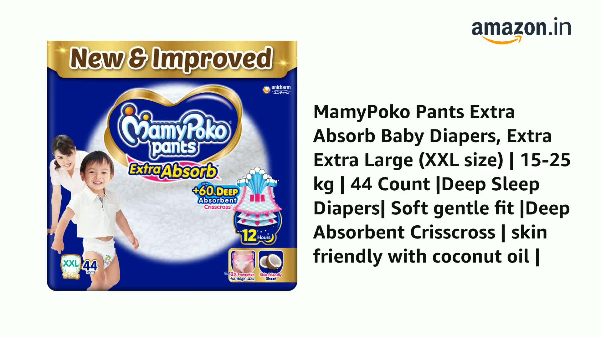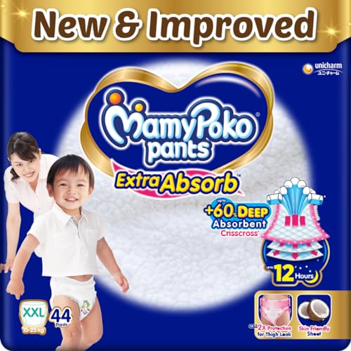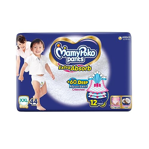 MamyPoko Pants Extra Absorb Baby Diapers, Extra Extra Large (XXL size) | 15-25 kg | 44 Count |Deep Sleep Diapers| Soft gentle fit |Deep Absorbent Crisscross | skin friendly with coconut oil |