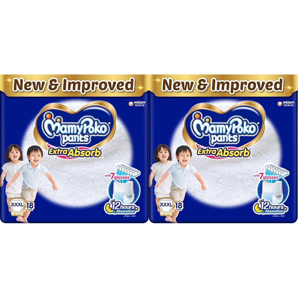 MamyPoko Pants Extra Absorb Baby Diapers XXX-Large (XXXL) 18 Count 18-35 kg (Pack of 2)