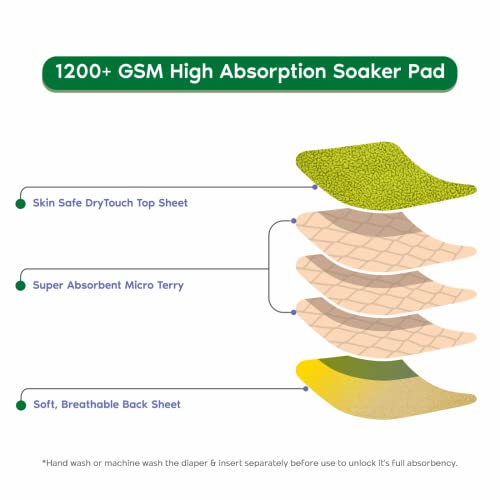 • HYBRID HIGH ABSORPTION SOAKER PAD :The Hybrid-High Absorption Soaker Pad is made with 1200+ GSM High Absorption Soaker Pad with DryTouch Skin Safe Layer which keeps the baby bum dry and does not lock any moisture. Made with Ultra Soft Surface and Fast Dry