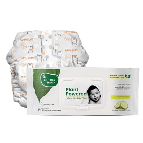 Mother Sparsh Plant Powered Cloth Diaper with FREE Plant Powered Water Baby Wipes (60Pcs) | Reusable Cloth Diaper for Babies with Built in Booster Pad | Cloth Like baby Wipes (Comfy)