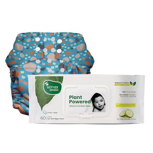 Mother Sparsh Plant Powered Cloth Diaper with FREE Plant Powered Water Baby Wipes (60Pcs) | Reusable Cloth Diaper for Babies with Built in Booster Pad | Cloth Like baby Wipes (Peppy)