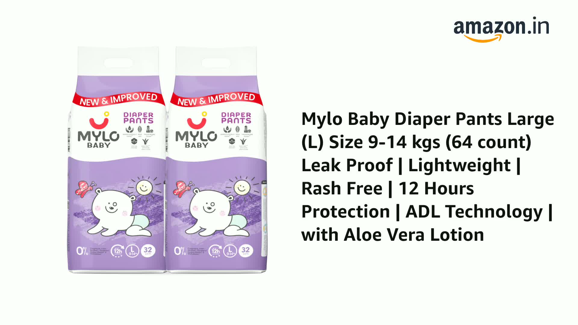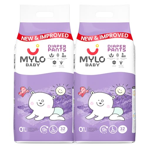 Mylo Baby Diaper Pants Large (L) Size 9-14 kgs (64 count) Leak Proof | Lightweight | Rash Free | 12 Hours Protection | ADL Technology | with Aloe Vera Lotion