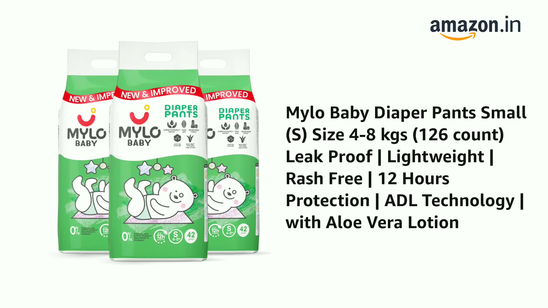 Mylo Baby Diaper Pants Small (S) Size 4-8 kgs (126 count) Leak Proof | Lightweight | Rash Free | 12 Hours Protection | ADL Technology | with Aloe Vera Lotion