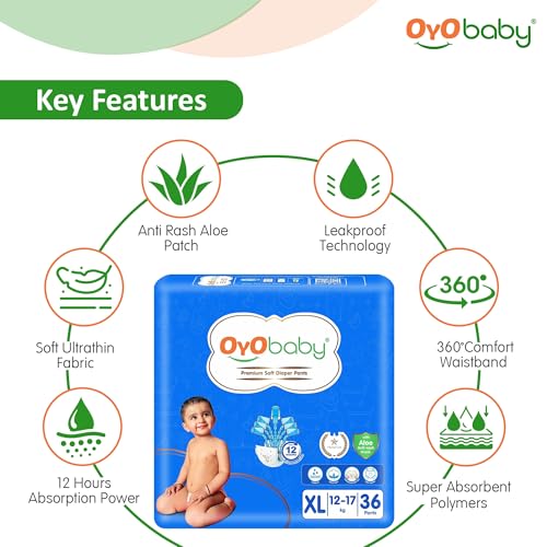 HomeBabyDiaperingBaby DiapersOYO BABY Pant Style Baby Diapers, Pack of 3 - Large (XL), 36Count, for Babies 12-17kg, with Aloe Vera Lotion for Rash Protection & Up to 12 Hours Protection