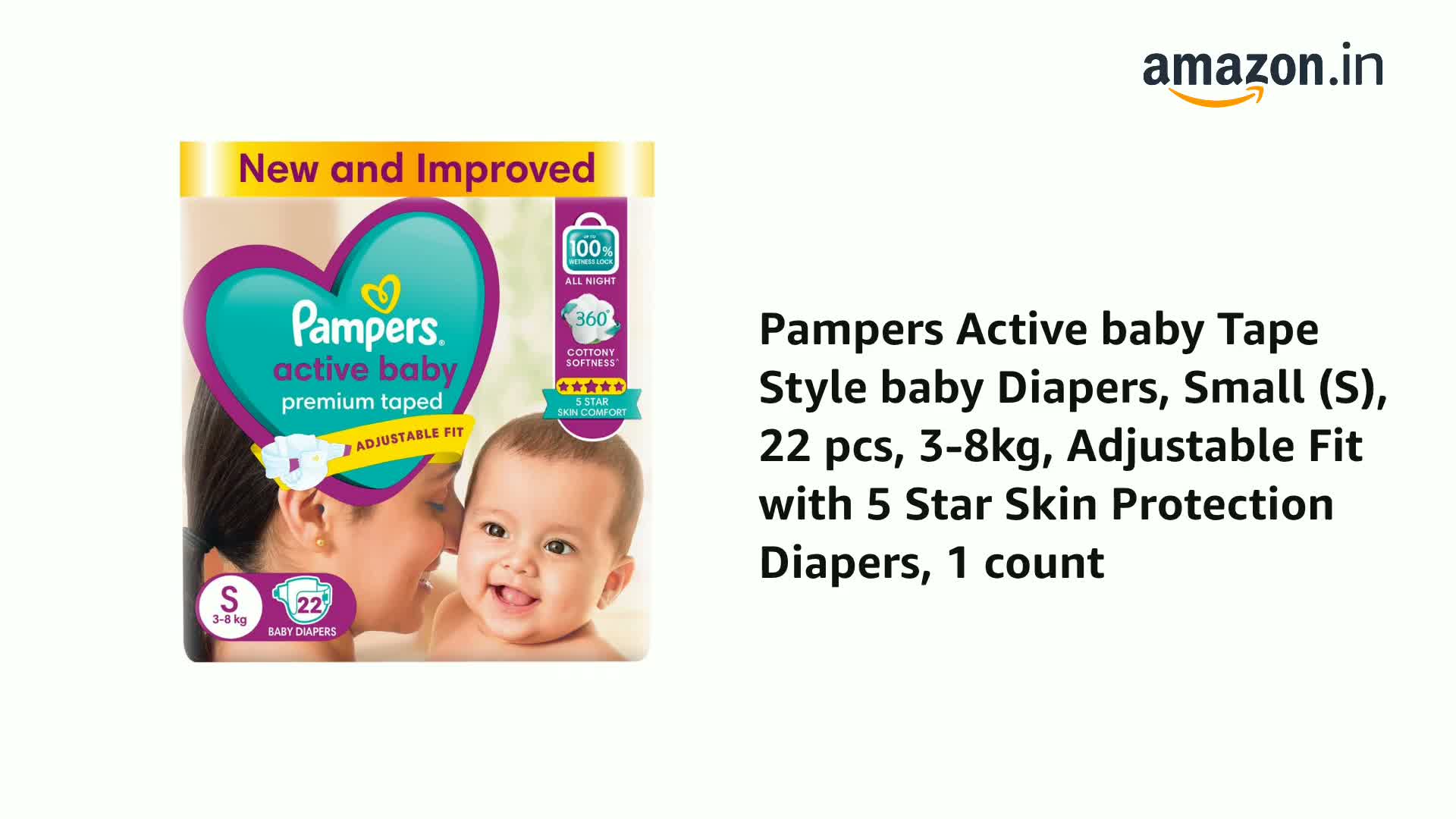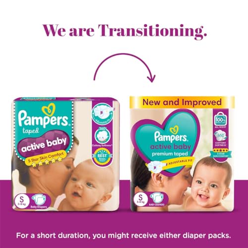 Product Description Your little miracle deserves gentle protection & full night sleep and mothers & doctors have always trusted Pampers to provide the care. Presenting New Pampers Active Baby taped diapers which provides your baby 5 star skin protection! How you ask? It has an Adjustable Taped Fit which you can custom-fit as per your baby need. The sides & waist are stretchable with 360 Degree Cottony Softness providing best comfort for your baby skin. Its Extra Dry Layer helps prevent leakage by spreading baby urine evenly and Pampers unique Magic Gel technology absorbs baby pee full night for up to 12 hrs. This is how these are Our Best Pampers Taped Diapers ever! Taped diapers adjustable custom fit cottony soft 12 hrs absorption best Pampers. From the Manufacturer Keep your baby's skin delicate with 5 star skin protection. Pampers Active Baby comes with 5 features in just one diaper. 12 hours dryness baby lotion cottony softness breathable cover and comfortable fit. 12 Hours DrynessOur driest diaper keeps baby's skin touchably dry for up to 12 hours. Baby LotionThis unique diaper is infused with baby lotion to help prevent diaper rash. Cottony SoftnessKeep baby's skin free from irritation with cotton-like softness. Breathable CoverAir circulates so baby's skin can breathe easily and stay wonderfully fresh. Comfortable FitA flexible side stretch design keeps it snug and comfy whether baby is at rest or play. Diaper SizerFive Features in One DiaperView Larger Comparison ChartView LargerUsing Pampers PantsWhen to ChangeRight before or right after every feedingAfter every bowel movementBefore bedtimeWhen your baby wakes upWhen you go out with your babyHow to ChangePut the diaper under the baby's body.Pull the elastic side properly.Apply both sides in symmetrical position on landing zone.Adjust the cuff around legs on both sides.