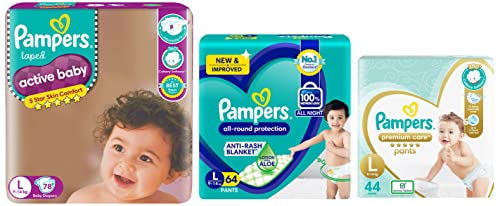 Pampers Active Baby Taped Diapers & All round Protection Pants Large size baby Diapers (L) 64 Count Lotion with Aloe Vera & Premium Care Pants Large size baby diapers (LG) 44 Count