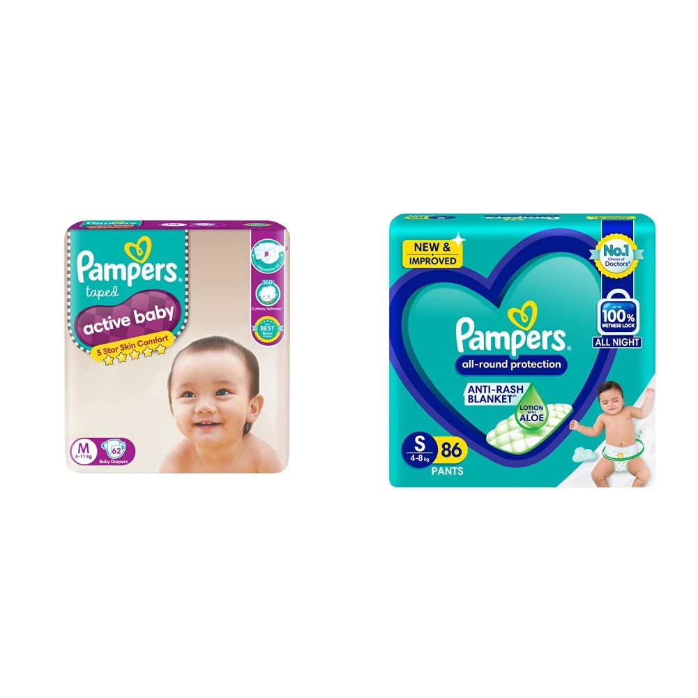 Pampers Active Baby Taped Diapers Medium size diapers (MD) 62 count taped style custom fit5 Star Skin Protection: The Best tape style diapers from Pampers with an outer layer of cotton-like softness this baby diaper provides intense care to your baby's sensitive skin and protects it effectively from friction rash and redness. These soft and comfort fitting diapers with stretchable sides are best for your baby's rest and playtime. The diaper's fastening tape sticks multiple times thus ensuring it stays in place even after you fasten it after checking your baby's diaper. Protection and nourishment of your baby's skin are taken care of with extracts of moisturizing Aloe Vera lotion characteristic of these best baby diapers.. These diapers are ultra-thin thanks to the absorbent gel material (AGM) commonly known as Magic Gel. This magic gel core of Pampers diapers is highly effective in absorbing frequent wetness. Naturally your baby's skin remains dry for upto 12 hours now no more frequent diaper changing or blow leaks for your little angel. Keep your baby's skin delicate with 5 star skin protection. Pampers Active Baby comes with 5 features in just one diaper. 12 hours dryness baby lotion cottony softness breathable cover and comfortable fit. 12 Hours Dryness Our driest diaper keeps baby's skin touchably dry for up to 12 hours. Baby Lotion This unique diaper is infused with baby lotion to help prevent diaper rash. Cottony Softness Keep baby's skin free from irritation with cotton-like softness. Breathable Cover Air circulates so baby's skin can breathe easily and stay wonderfully fresh. Comfortable Fit A flexible side stretch design keeps it snug and comfy whether baby is at rest or play. Diaper Sizer Five Features in One Diaper View Larger Comparison Chart View Larger Using Pampers Pants When to Change Right before or right after every feeding After every bowel movement Before bedtime When your baby wakes up When you go out with your baby How to Change Put the diaper under the baby's body. Pull the elastic side properly. Apply both sides in symmetrical position on landing zone. Adjust the cuff around legs on both sides.Pampers All round Protection Pants Small size baby Diapers (S) 86 Count Lotion with Aloe VeraNEW & IMPROVED Pampers all-round protection pants have ANTI-RASH BLANKET* containing Lotion with Aloe Vera to keep your baby’s skin protected from redness irritation and rashes. Best quality diapers with 100% WETNESS LOCK keeps the pee locked inside & baby's bum stays dry for ALL NIGHT. Air channels & stretchy belt provides your baby breathable airy fit - comfortable even in summers. Pampers unique Magic gel technology provides up to 12 hours of dryness – and has 2X faster absorption. The new and improved product design enables a comfortable fit closer to the baby’s body and an EXTRA SOFT flexible waist band that adapts to baby’s movements for best comfort. Available in all sizes – Small diapers medium diaper pants large size diaper pants XL diapers XXL diapers XXXL diaper pants. A top layer with cotton-like soft material ensure a comfortable night’s sleep. Our pants with fun exterior graphics fun designs of characters and a delightful fresh Aloe fragrance ensures you enjoy every change with your baby. (*Blanket refers to soft topsheet with lotion. Helps prevent rash due to wetness after 1 day of usage based on clinical studies in USA 2000-2019).