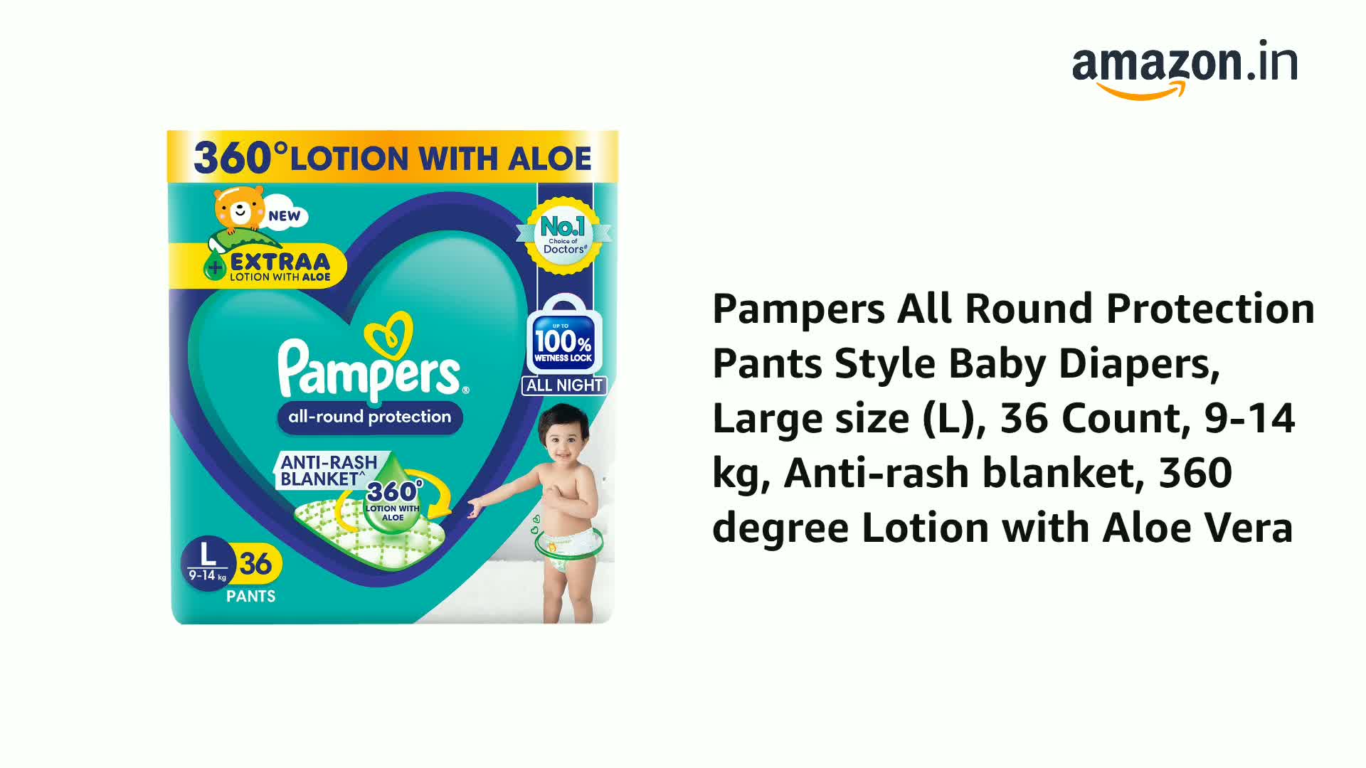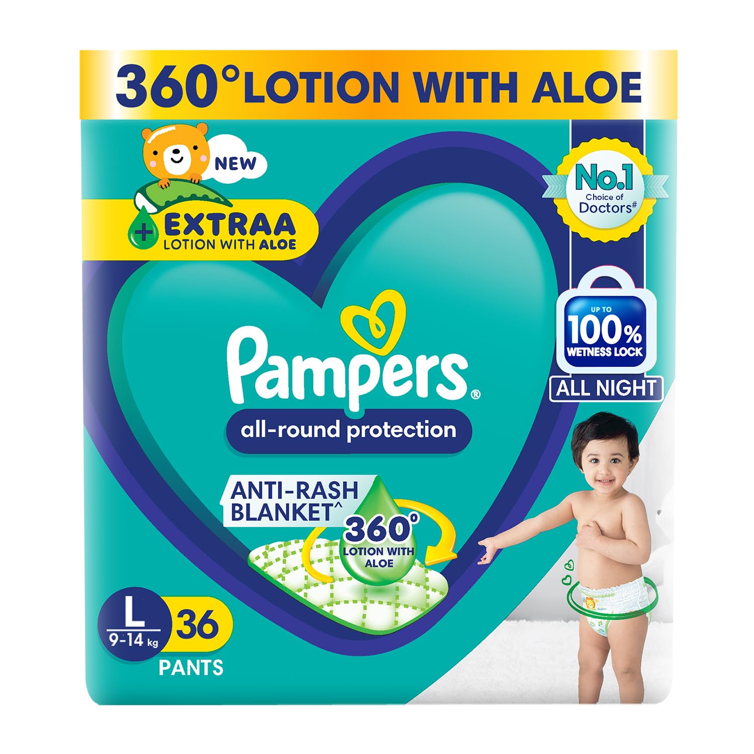 Pampers All Round Protection Pants Style Baby Diapers, Large size (L), 36 Count, 9-14 kg, Anti-rash blanket, 360 degree Lotion with Aloe Vera