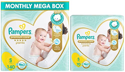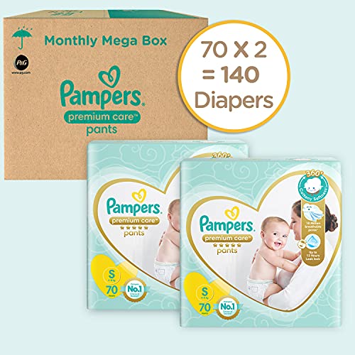 Pampers Premium Care Pants Diapers Small 70 CountNew Pampers premium pants with cotton like soft materials is best for your baby’s delicate skin. Pampers premium pants contain lotion with aloe vera and 3 air channels which helps your baby’s skin breathe. Experience 5 star comfort with unique added features like wetness indicator which turns yellow to blue indication when you may change and disposal tape which helps you in easy disposal of the diaper. Pampers is the no.1 choice of doctors for diapers. Pampers premium pants are available in new born (nb) s m l xl and xxl sizes.Pampers Premium Care Pants Diapers Small 140 CountNew Pampers premium pants with cotton like soft materials is best for your baby’s delicate skin. Pampers premium pants contain lotion with aloe vera and 3 air channels which helps your baby’s skin breathe. Experience 5 star comfort with unique added features like wetness indicator which turns yellow to blue indication when you may change and disposal tape which helps you in easy disposal of the diaper. Pampers is the no. 1 Choice of doctors for diapers. Pampers premium pants are available in new-born (NB) S M L XL and XXL sizes