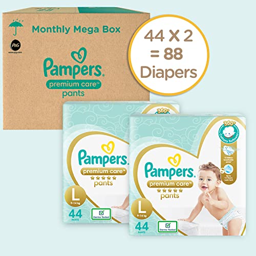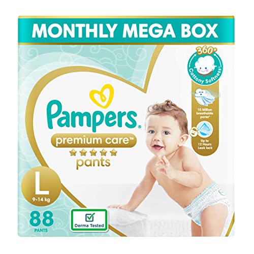 Pampers Premium Care Pants Large size baby Diapers (L) 88 Count Softest ever Pampers PantsNew Pampers Premium Care Pants with 360 degree cottony softness gives your baby the ultimate comfort all day all night long. Pampers Premium Care Pants contain soothing lotion with Aloe Vera to protect your baby’s skin from rashes while its 10 million micropores allow your baby’s skin to breathe. Its 12-hour leak lock facility keeps your baby dry and away from wetness. Experience 5-Star comfort with unique added features like Wetness Indicator which turns Yellow to Blue indicating when you may change the diaper and a Disposal Tape to help you with easy disposal. Pampers Premium Pants are available in New-born (NB) S M L XL and XXL sizes.Pampers Active Baby Taped Diapers Large size diapers (LG) 78 count taped style custom fit5 Star Skin Protection: The Best tape style diapers from Pampers with an outer layer of cotton-like softness this baby diaper provides intense care to your baby's sensitive skin and protects it effectively from friction rash and redness. These soft and comfort fitting diapers with stretchable sides are best for your baby's rest and playtime. The diaper's fastening tape sticks multiple times thus ensuring it stays in place even after you fasten it after checking your baby's diaper. Protection and nourishment of your baby's skin are taken care of with extracts of moisturizing Aloe Vera lotion characteristic of these best baby diapers.. These diapers are ultra-thin thanks to the absorbent gel material (AGM) commonly known as Magic Gel. This magic gel core of Pampers diapers is highly effective in absorbing frequent wetness. Naturally your baby's skin remains dry for upto 12 hours now no more frequent diaper changing or blow leaks for your little angel.