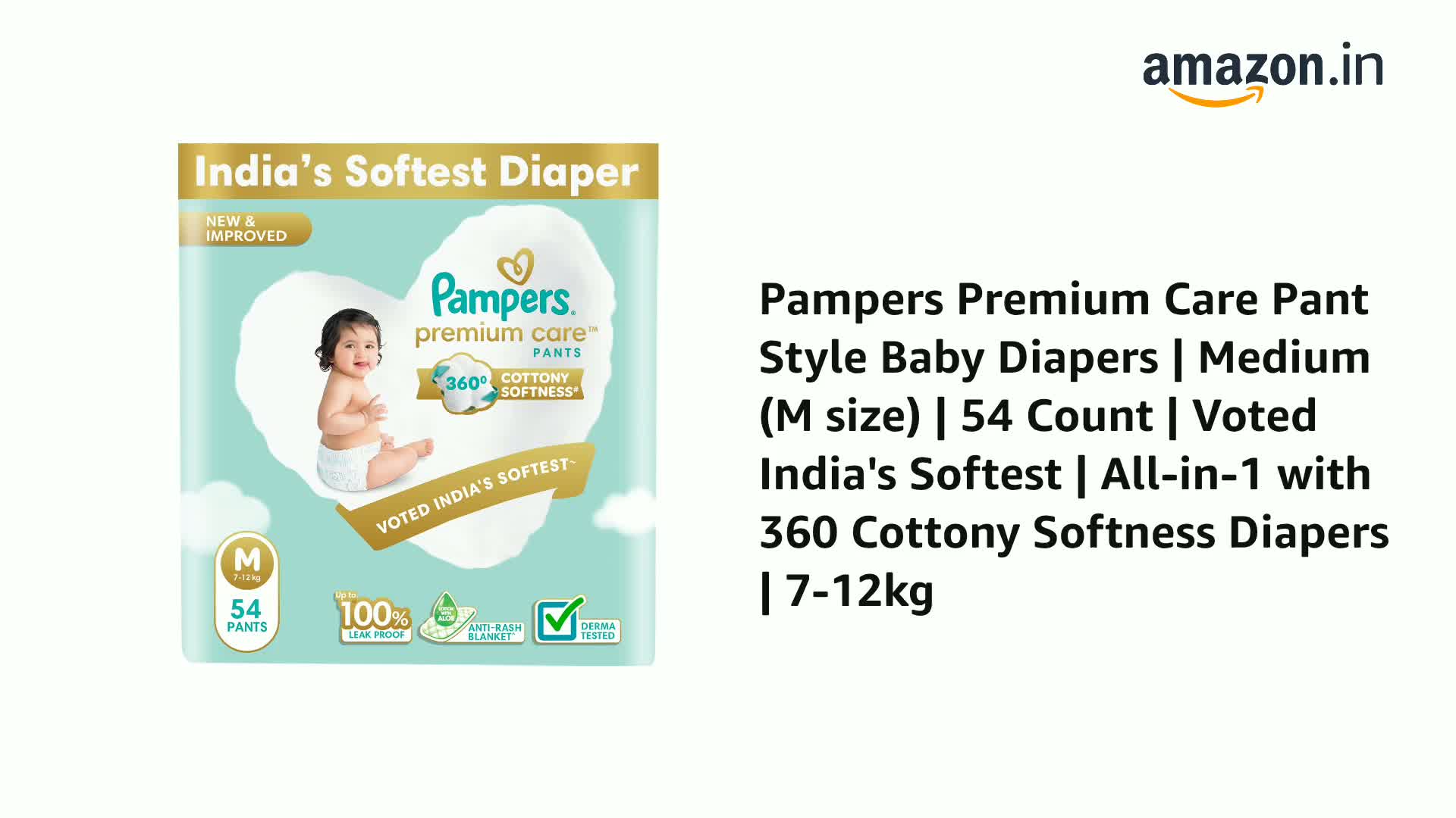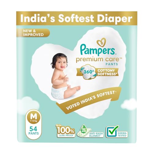 Pampers Premium Care Pant Style Baby Diapers | Medium (M size) | 54 Count | Voted India's Softest | All-in-1 with 360 Cottony Softness Diapers | 7-12kg
