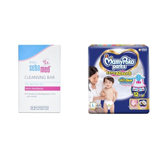 Sebamed Baby Cleansing Bar 150g|Ph 5.5 & MamyPoko Pants Extra Absorb Baby Diapers, Large (L), 64 Count, 9-14kg