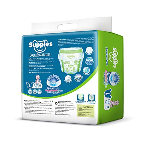 Supples Baby Pants Diapers Large 62 CountThese diaper pants keep your baby comfortable in the day as well as in night. Their cottony soft material is gentle on your baby skin keeping their precious skin perfect.Supples Baby Wet Wipes with Aloe Vera and Vitamin E - 72 Wipes/Pack (Pack of 3)Infused with the goodness of aloe vera and vitamin e the Supples baby wipes are a handy way to keep your baby's delicate skin refreshed and clean. The Supples baby wipes are 100 percent free from alcohol parabens soap chlorine and other toxic elements and thus entirely safe for everyday use. Take it anywhere you go with your baby and protect your little one from skin infections.