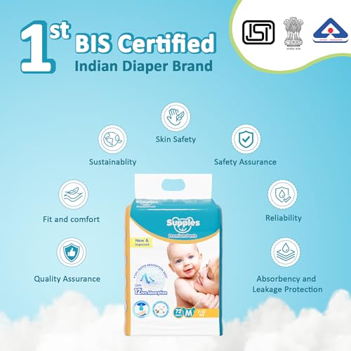 SUPPLES PREMIUM DIAPER PANTS: Choosing the diaper for your baby is an important step in ensuring your little one comfort during the day as well as overnight. We understand that nothing is more important than the comfort of your little baby. With Supples Premium diaper pants we want to keep your baby comfortable both in day as well as in night thus delivering happiness to every doorstep. Choosing the right diaper size based on baby weight is important. The diaper capacity may vary among babies depending on the volume of pee and posture. Available in sizes NB S M L XL XXL