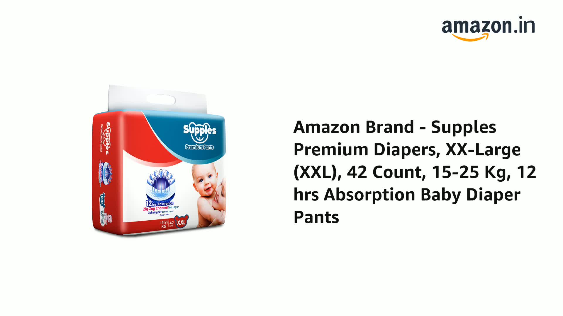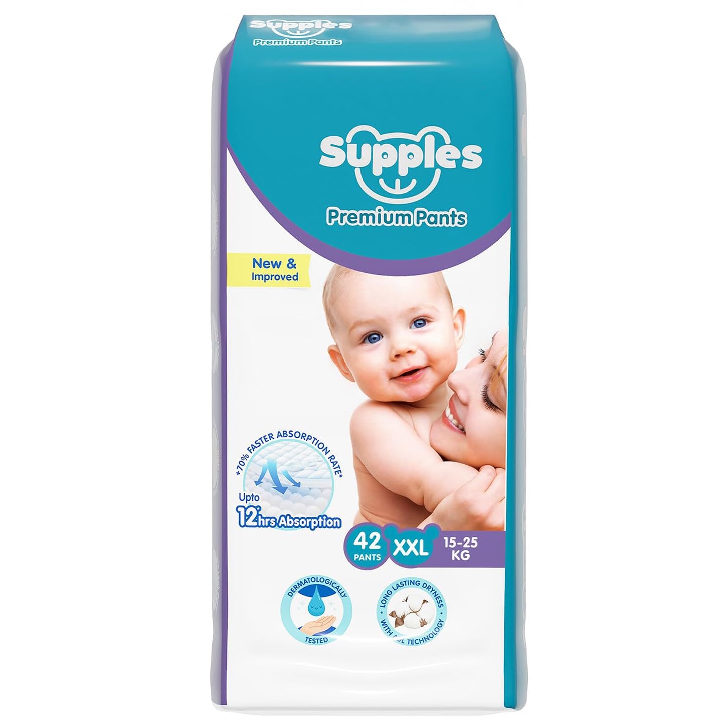 Amazon Brand - Supples Premium Baby Diaper Pants | 42 Baby Diapers | XXL | 15-25 Kg | 12 Hrs Absorption | Cushiony Cotton Soft Fabric | Phthalates-Free | Triple Leak Guard