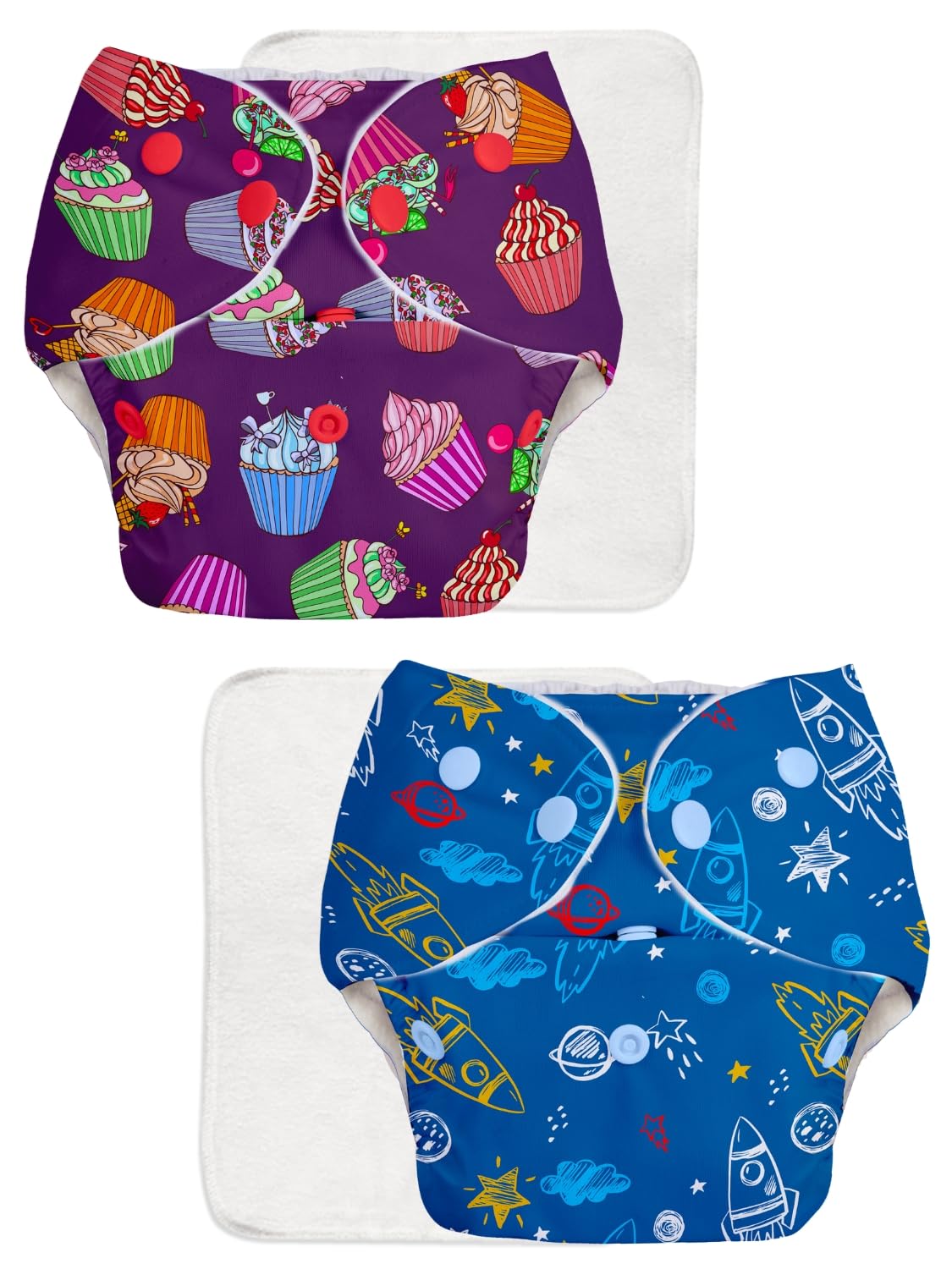 Contents: 2 trim diaper with stay dry lining and a opening 2 hourglass(contour) shape terry cotton insert SIZE: Free Size - Adjustable diaper (1 diaper= 4 different sizes) IDEAL AGE/ WEIGHT: 5kg 17 kg babies and toddlers3 months- 3 years A diaper that grows with your babyPRE- USE INSTRUCTIONS The diaper and soaker need to be washed once before use. They both are completely washable & reusable for atleast 300 times. HOW TO USE BASIC Cloth Diaper by SUPERBOTTOMS: STEP 1: ALWAYS wash the diaper atleast once before use using detergent Skipping this step CAN CAUSE leaks. STEP 2: ALWAYS size diaper before use using the front panel of snaps (check fit and size infographics). There are 12 snaps in front meant for reducing size. The size must be such that there are NO GAPS around the thigh. A loose diaper can be uncomfortable for babies. STEP 3: Snap on the insert to the diaper with help of the snaps or Insert the soaker/ insert in the diaper pocket. One soaker will last 2.5- 3 hours for an average wetting baby. If your baby is a heavy wetter please add additional inserts. You can also check out our bestseller Superbottoms Plus UNO AIO with 2 certified organic cotton inserts. WASH CARE: Before Washing : 1.If diaper has been pooped in knock poop off rinse diaper and keep in lightly covered bucket or wetbag 2. If diaper has been peed in it can be stored as it is till wash. Store in a lightly covered bucket or wet bag. WASH ROUTINE: 1. Prewash (Rinse thoroughly) 2. Main wash using regular detergent in sufficient quantity (not more or less) and wash well in machine or by hand - rub well. (Choose detergents like regular Surf which do not have softeners added fragrances etc. DO NOT use baby detergent 3.Machine dry/ line dry. Sun drying is ideal
