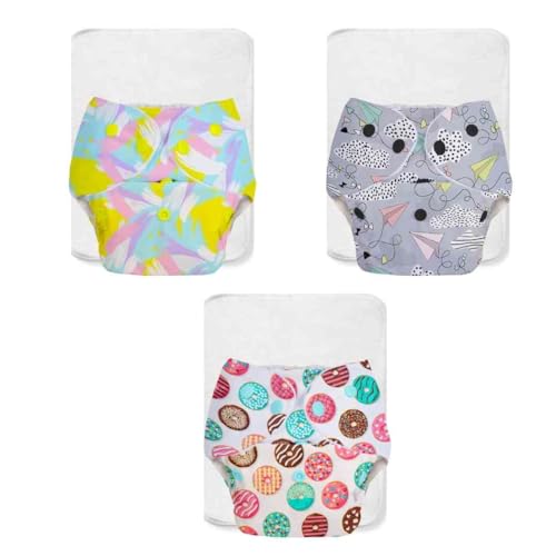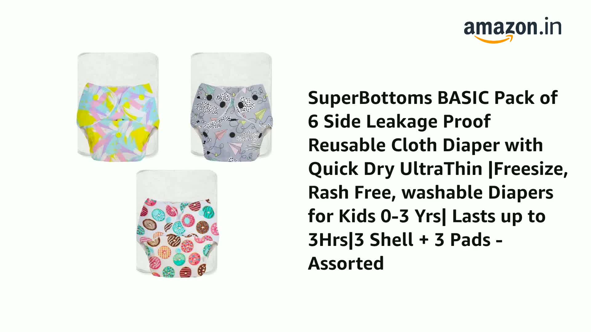 SuperBottoms BASIC Pack of 6 Side Leakage Proof Reusable Cloth Diaper with Quick Dry UltraThin |Freesize, Rash Free, washable Diapers for Kids 0-3 Yrs| Lasts up to 3Hrs|3 Shell + 3 Pads - Assorted