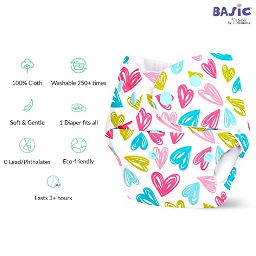 SuperBottoms BASIC Reusable Cloth Diaper with NEW Quick Dry UltraThin pads | 100% cloth Freesize Diapers for baby 0-3 Yrs |Stay Dry & Lasts up to 3Hrs | Trim Fitting Dries 2times faster | Hearts