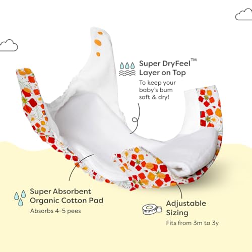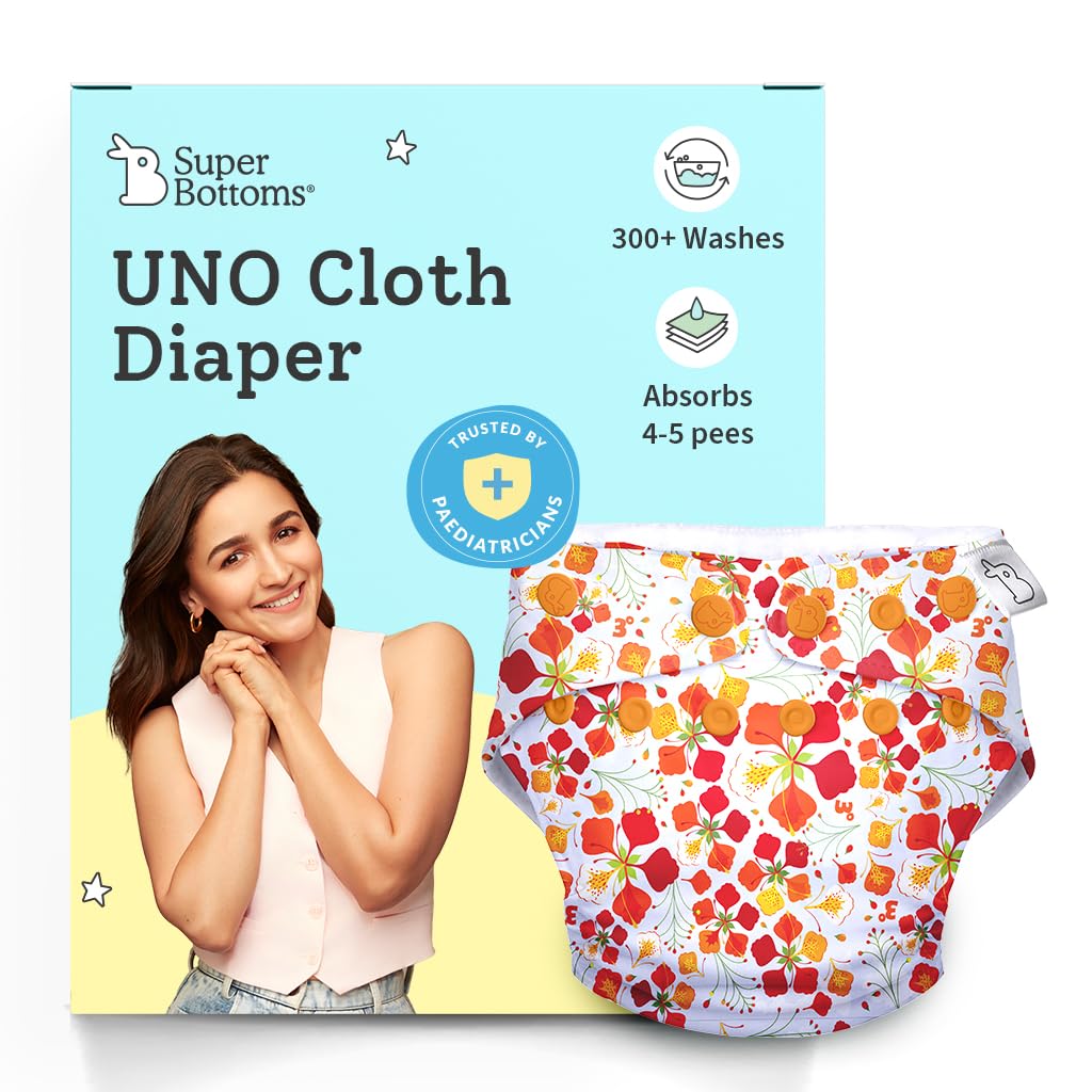 SuperBottoms UNO Freesize Cloth Diaper | Cloth diaper for babies 0 to 3 years | Washable & Reusable cloth diaper | Comes with cloth diaper inserts | 1 Organic cotton Soaker (Gulmohar <3)