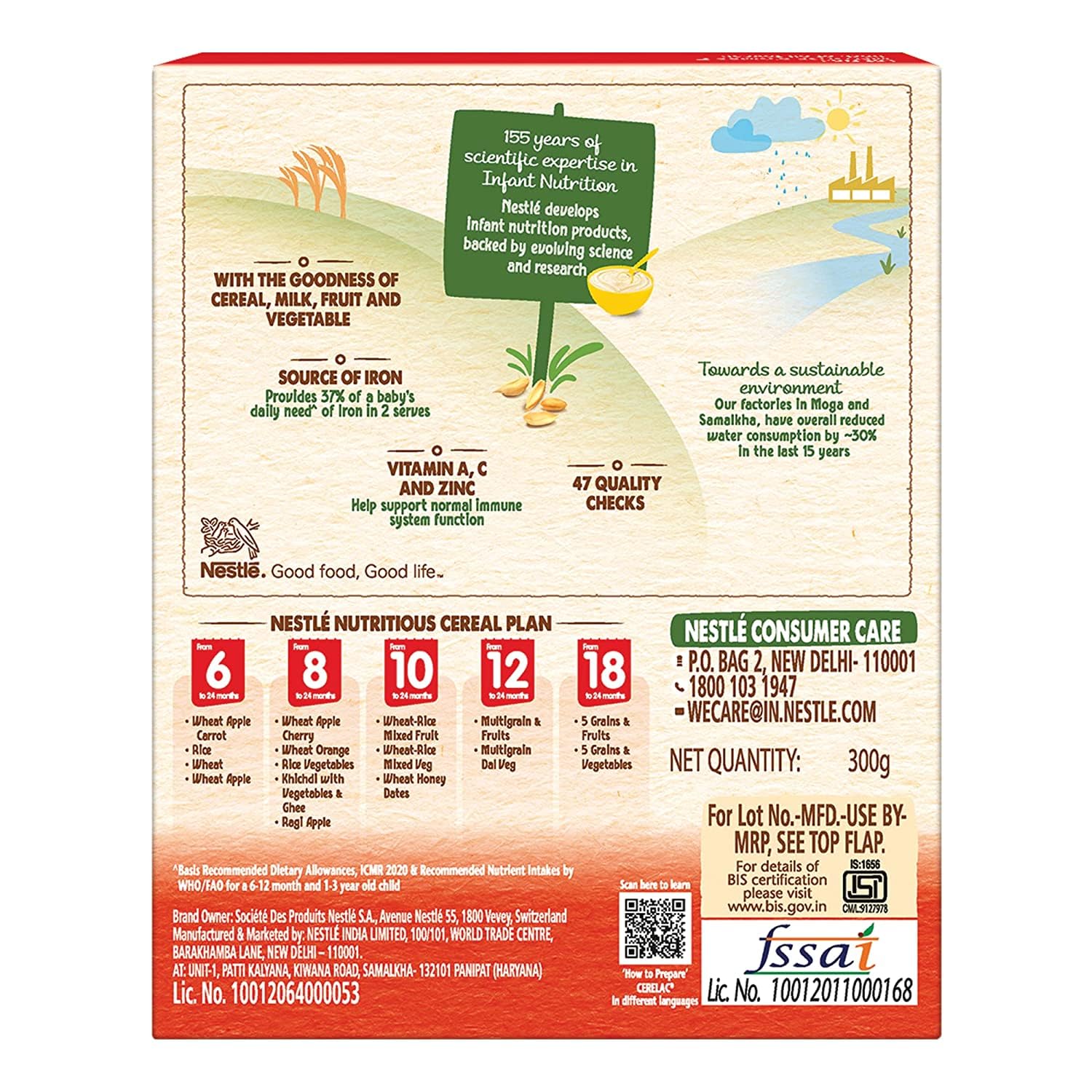 Nestle Cerelac Baby Cereal with Milk is a complementary baby food for infants from 6 to 24 months. While infants and children have higher requirements of nutrients than adults 2 serves of Cerelac Wheat Apple Carrot Cereal provide 37% of a babydaily needof iron. It is also a source of 14 important nutrients including vitamins and minerals. Vitamin A C and Zinc help support normal immune system function. This baby cereal is rich in protein and packed with the goodness of cereal milk fruit and vegetable. With 155 years of scientific expertise in infant nutrition Nestle develops infant nutrition products backed by evolving science and research. Innovation has been at the heart of Nestle since its beginning. Usage: Step 1: Wash and dry your hands before preparing baby's food. Make sure all utensils are throughly clean. Step 2: Boil clean drinking water for 5 minutes. Allow to cool until lukewarm. Measure the quantity of water as mentioned on the table-1 above and pour it into the babybowl. Step 3: Add the number of scoops of CERELAC as mentioned in the table 1. Step 4: Stir until the cereal is smooth and feed immediately using a clean spoon. Warning: Infant food should be used only on advice of a health worker as to the need for its use. Discard unused feed. Infant food is not the sole source of nourishment. Storage Instructions - After opening the pack the contents should immediately be transferred to an empty clean dry and airtight container. After each use replace lid tightly & store in a cool dry and hygenic place.