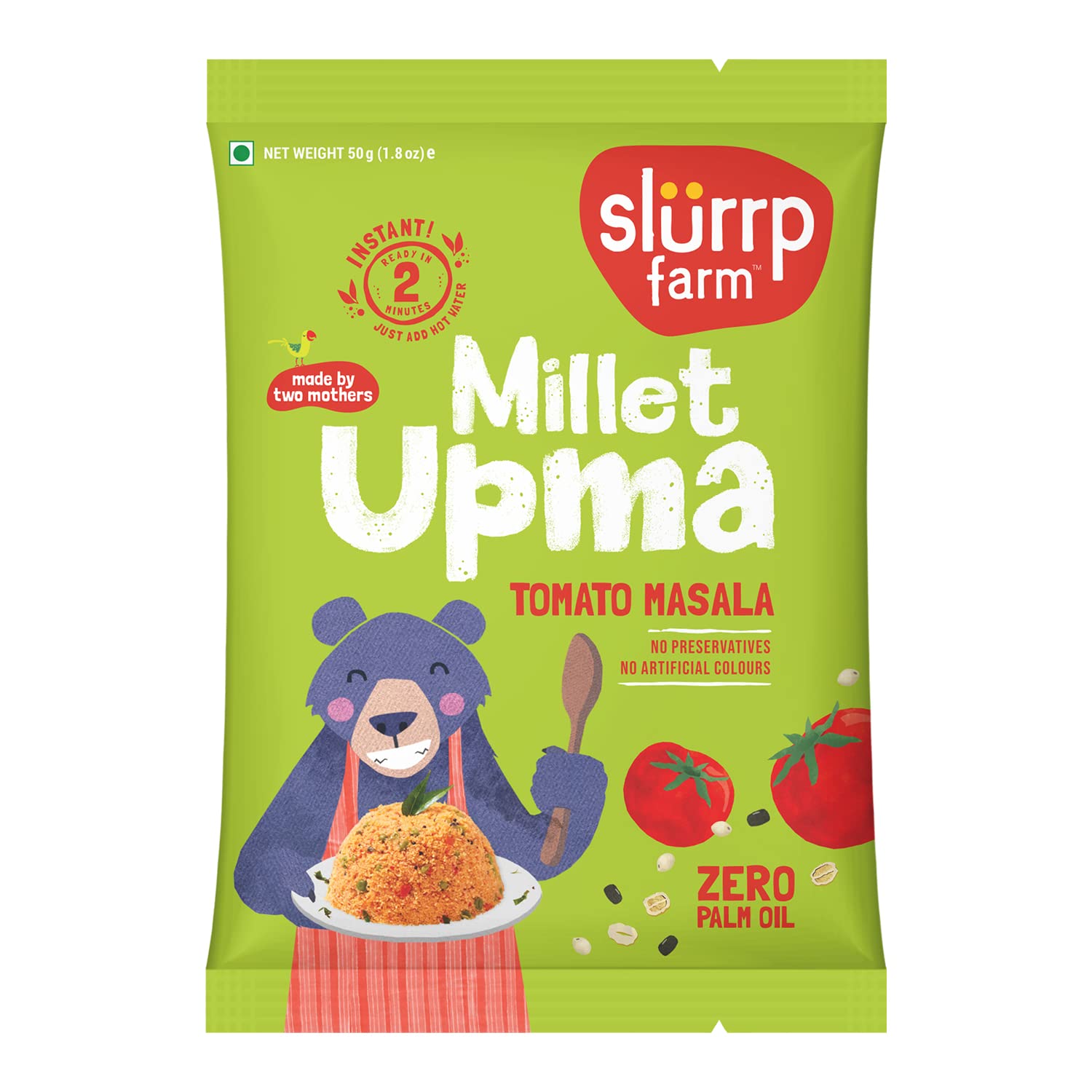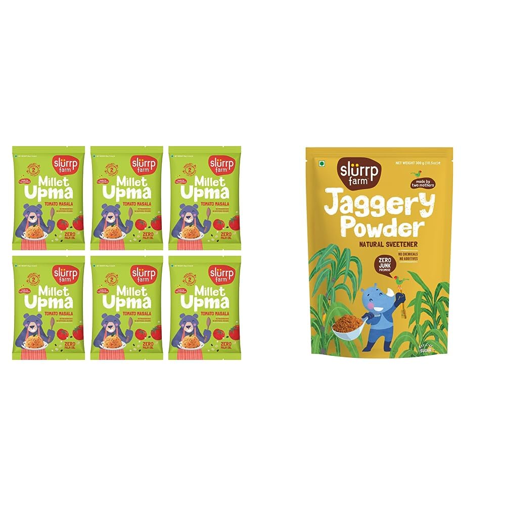 Slurrp Farm Instant Millet Rava Upma Mix- Tomato Masala | Multigrain Breakfast Mix | No Palm Oil | 50g X 6An instant breakfast meal made with a blend of millets (jowar oats bajra) chana suji and urad dal. Comes in yummy ghee & tomato masala flavours with no preservatives no artificial colours or flavours no trans fat no palm oil. Ready in 2 minutes. Slurrp Farm Millet Upma Mix is a convenient and nutritious option during morning rush or travel with family. Now everyone will be #UpForUpma \U0001f60b\U0001f60Slurrp Farm Natural Jaggery Powder 300 GSlurrp Farm is founded by two mothers for their children and yours. Our mission is to provide tasty and all natural alternatives to the junk food that surrounds us today. This means no preservatives no artificial flavours and no artificial colours. We are passionate about raising awareness of healthy eating for children by giving parents convenient food options which are as good as what we would make at home.