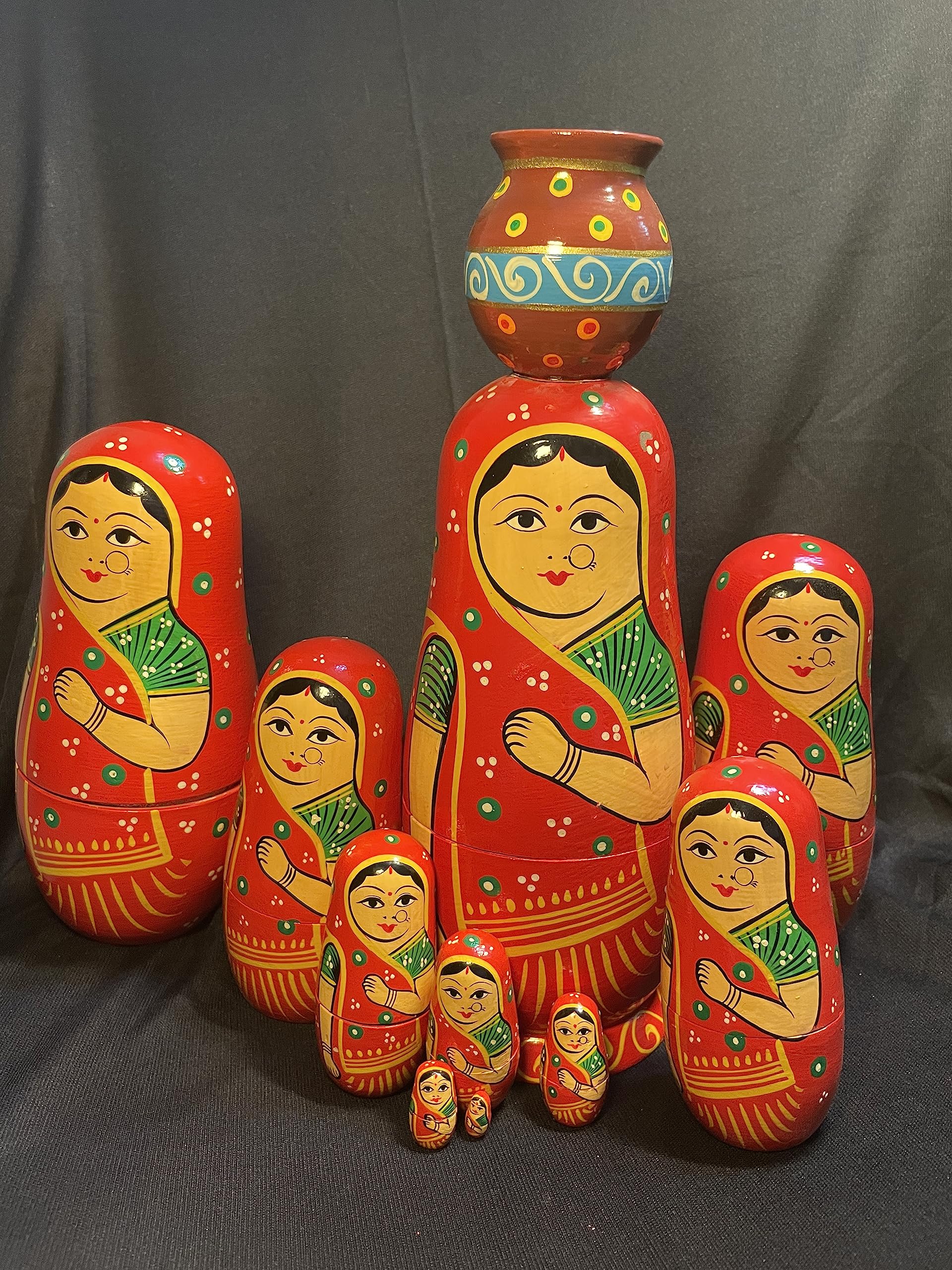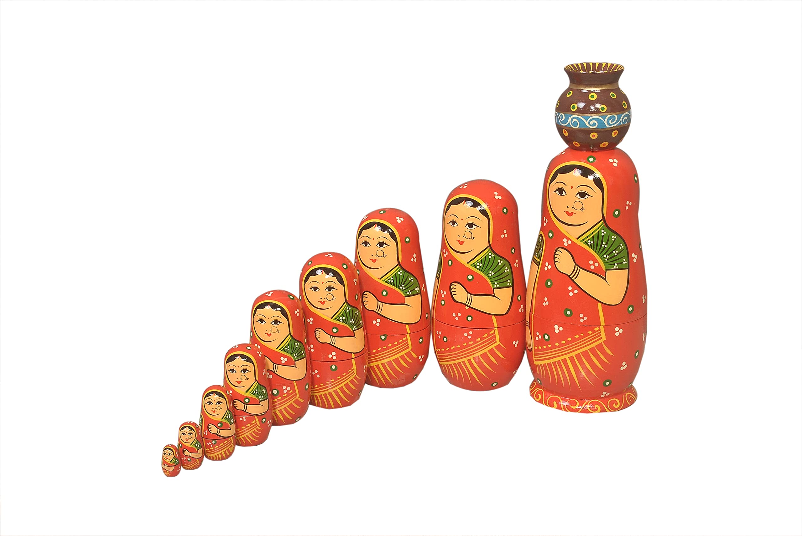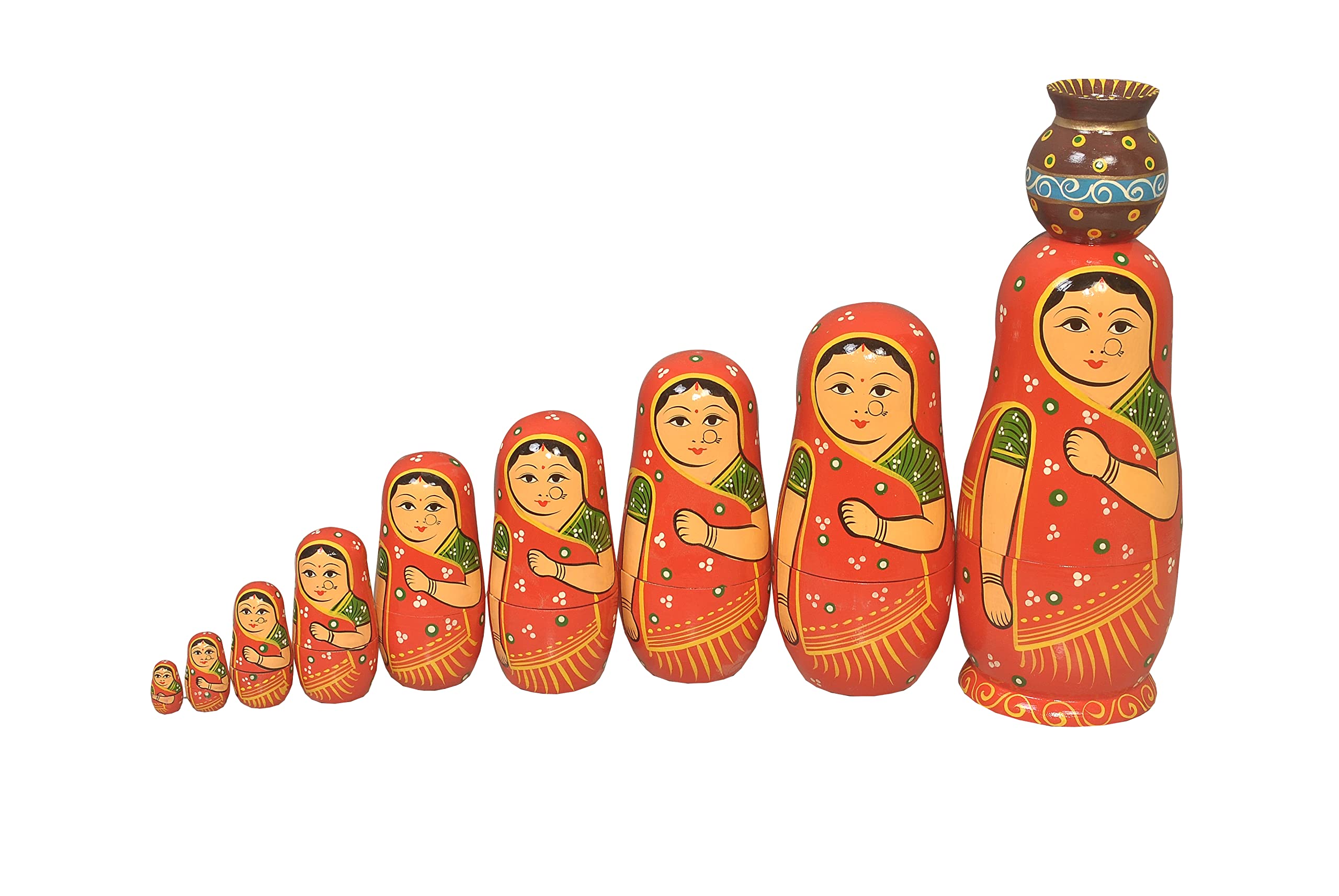 VARANASI WOODEN TOYS Handmade Wooden Stacking Dolls with Pot Red 10pcs Set (12 cm x 8 cm x 27 cm)